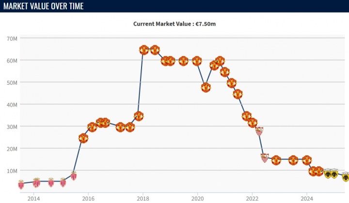 值得一提的是,2015年19岁的马夏尔曾以6000万欧元转会费加盟曼联,并在当年获得欧洲金童奖。在2018年,马夏尔的德转身价达到生涯巅峰,高达6500万欧元。这位法国前锋在曼联总计代表球队出场317次,贡献90球54助。